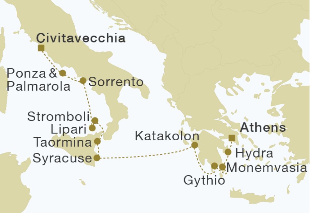 Barreling under full sail through the narrow Strait of Messina past Scylla and Charybdis, where rock and whirlpool almost claimed Ulysses, you arrive in lovely Taormina. Perched on the shoulder of Mt. Etna, Taormina inspired Goethe to say that'It is the greatest work of art and nature.'